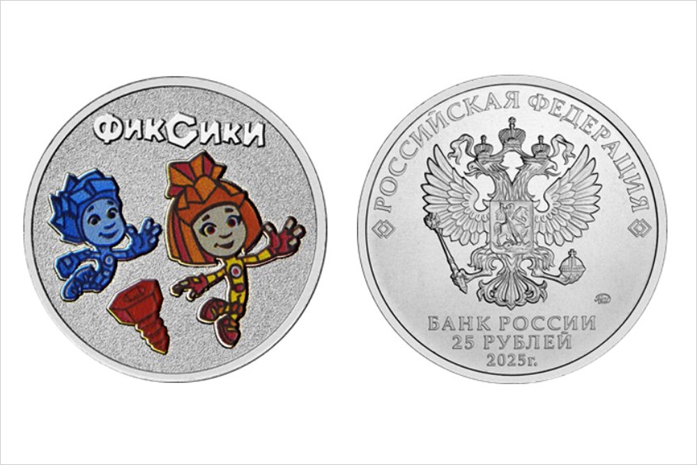 Диаметр 25-рублевых монет из недрагоценных металлов составляет 27 мм, они тоже имеют на своей оборотной стороне изображения "Фиксиков", причем на монете из медно-никелевого сплава оно выполнено в цвете.