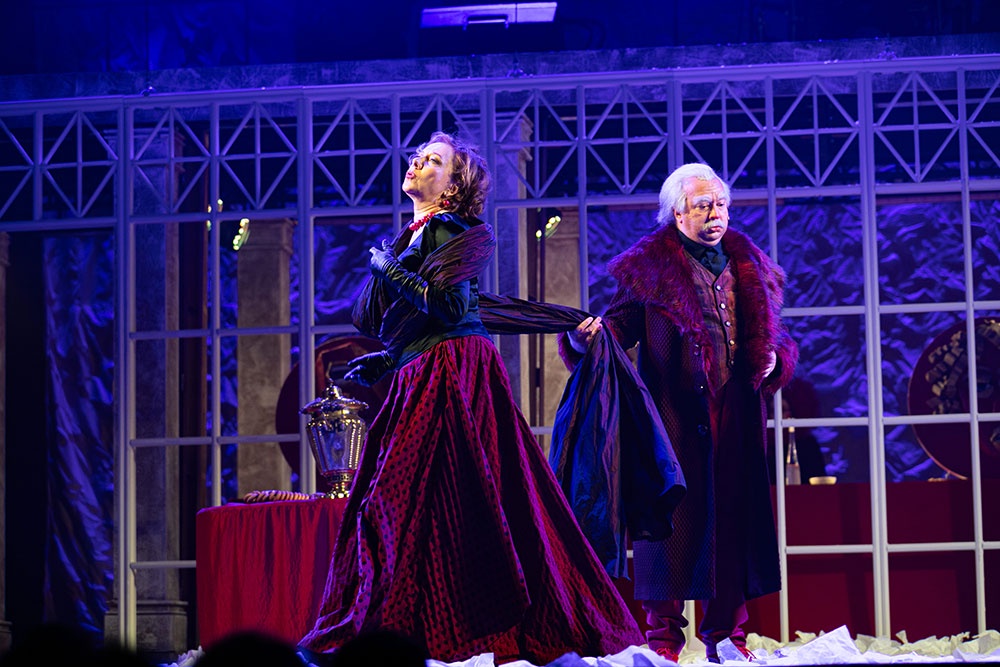Елена Симонова: Мы создавали "Мудреца" этюдным методом. История близости наших героев родилась в этом процессе. Мне было маловато Турусиной. Мы решили, что в молодости у наших героев были бурные отношения, и оттуда "плясали". Она престарелая Джульетта, до сих пор видит себя молодой женщиной. Он читает ей стихи…