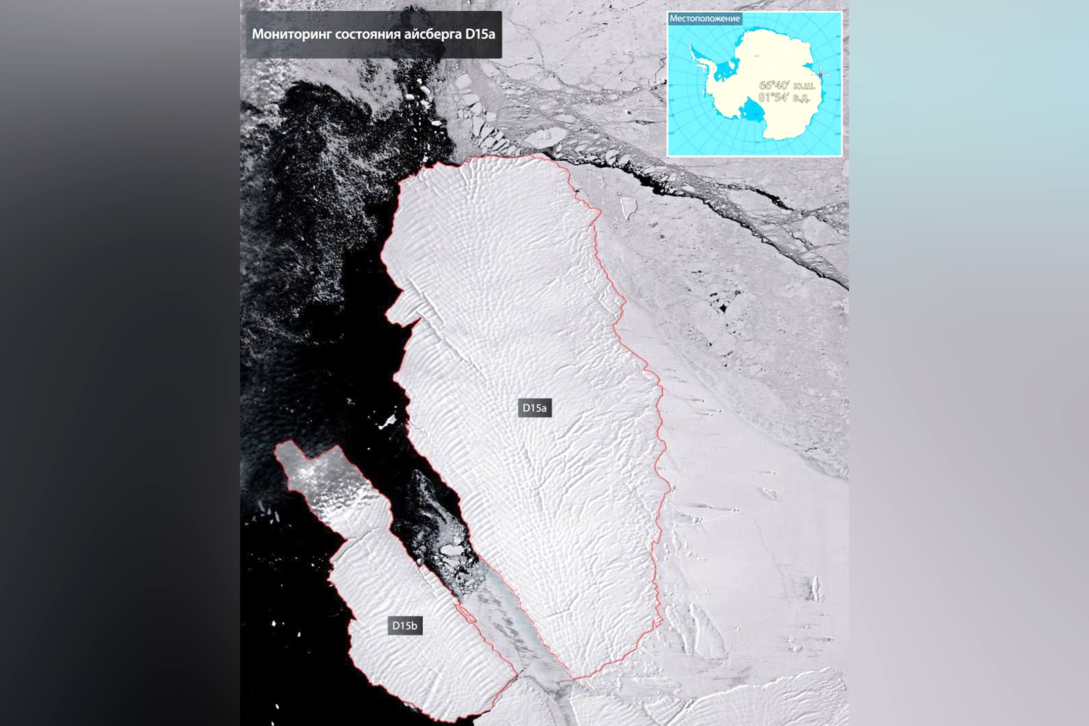 Айсберг D15а откололся от шельфового ледника в январе 2016 года и в настоящее время находится на мели недалеко от побережья Земли Принцессы Елизаветы в Восточной части Антарктиды. По оценкам ученых, площадь нового "лидера" составляет 3 071 квадратный километр, что вдвое больше текущих размеров А23а.