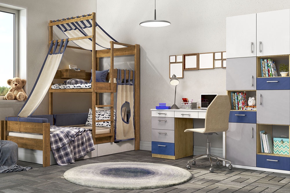 - использовать пространство по вертикали. На втором уровне дети спят, а внизу под одной кроватью диван, где можно посидеть или уложить спать приехавшую в гости бабушку, а под другой - небольшая гардеробная или рабочая зона для одного из детей.