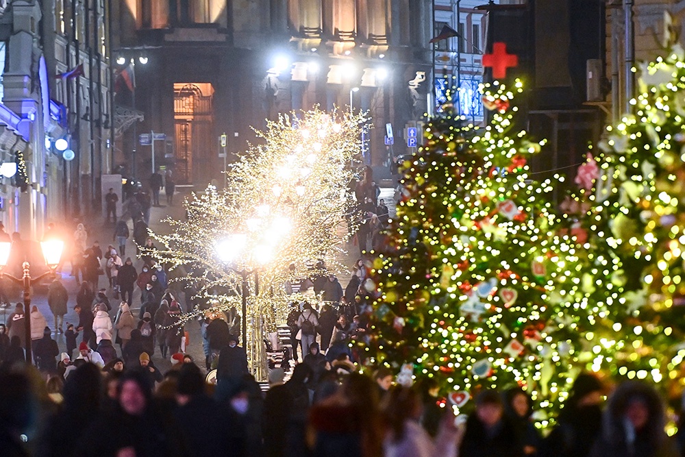 Иду по Сретенке в сторону Лубянки, то и дело попадая на тротуаре в пробки. Рядом с магазинами и барами мамы с дочками, шумные подростки, дамы в элегантных костюмах останавливаются, чтобы сделать на фоне витрин селфи. Возле одной, которая издалека светится, молодежь даже установила профессиональную камеру и что-то снимает. Остановилась рассмотреть декорации и я. В доме под номером 26 вход в магазин в звездах, подарках и леденцах, а в начале 24-го дома ресторан наряжен в рождественские гирлянды с бантами. Фасад 16-го дома украшен лапником у входа в модный бар. На Кузнецком Мосту, 18/7, вход в заведение - тоже в еловых ветках, а с них мандарины огромных размеров свисают в сетке, как с прилавка.