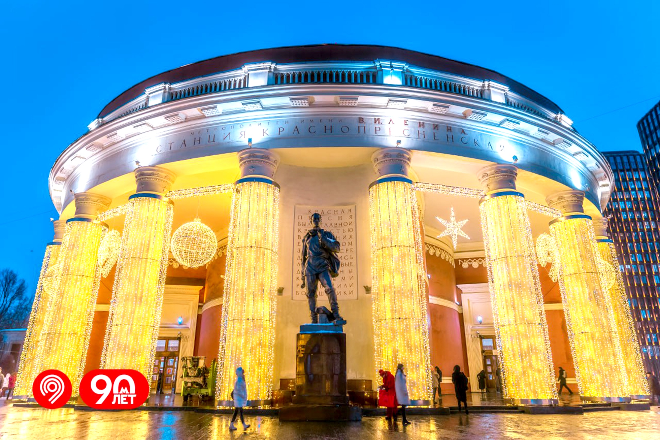 На "Краснопресненской" декорировали не саму станцию, а ее вестибюль - его фасад украсили километрами гирлянд и светящимися объемными игрушками, а также логотипом Московского транспорта.