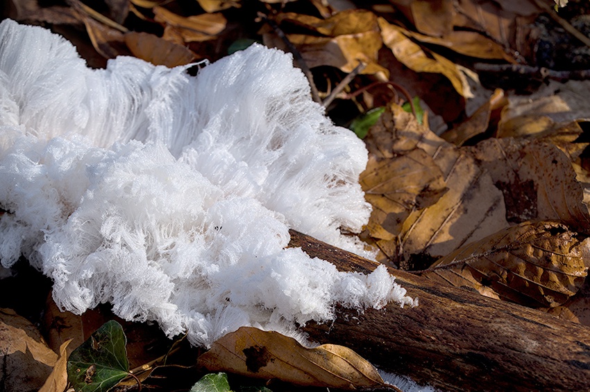Как пояснили в геопарке, чтобы получились такие ледяные наросты, необходимы несколько факторов. Во-первых, лед образуется только на гниющей древесине, внутри которой обитает особый гриб Exidiopsis effusa (эксидиопсис распростертый). Он не дает мелким кристалликам льда, образующимся на поверхности древесины, срастись в более крупные кристаллы и корки. Во-вторых, температура воздуха должна быть ниже нуля градусов. В-третьих, необходима высокая влажность и безветренная погода.
