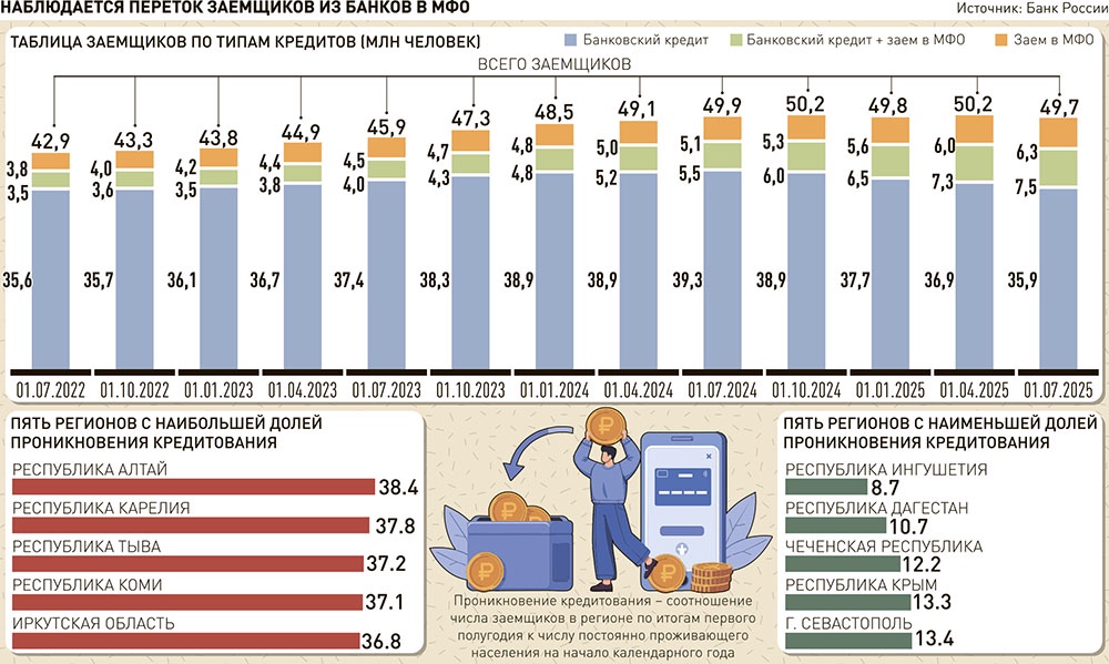 Число россиян с займами в микрофинансовых организациях (МФО) достигло 13,8 млн по итогам первой половины 2025 года, поднявшись за полгода на 1,7 млн, а за год - на 3,2 млн человек, если учитывать и заемщиков, у которых помимо микрозайма есть в том числе кредит в банке.