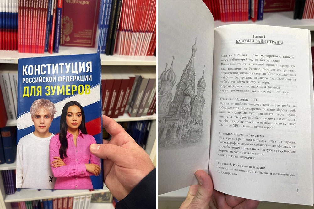 Есть и фотографии этого издания, где в оглавлении видны названия статей: "Базовый вайб страны" (на самом деле глава называется "Основы Конституционного строя"), "Права и свободы чела", "Иерархия: кто в какой пати", "Как вносить апдейты" и т.д.