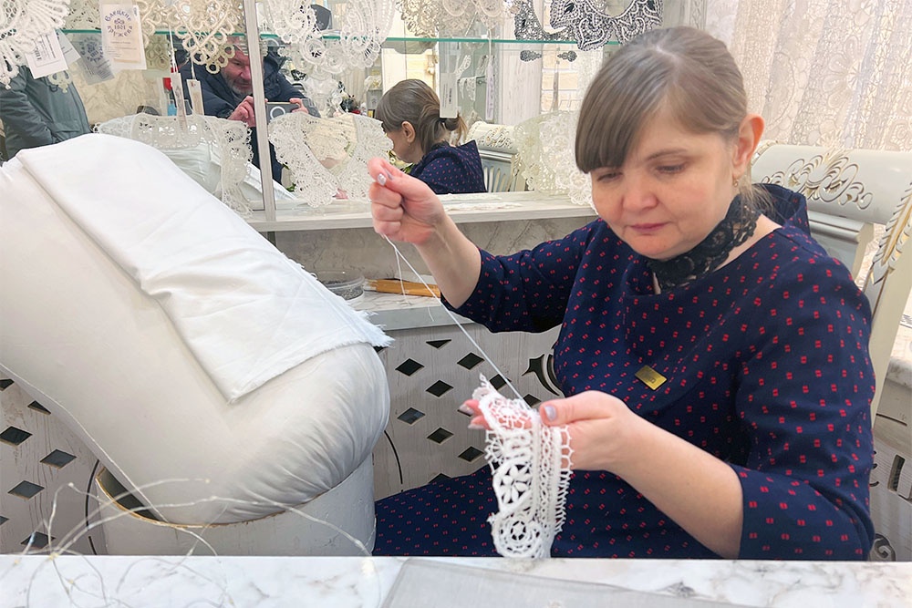 Есть вологодские кружева, а есть елецкие. В художественном салоне сидит Инесса и плетет их. На подушке коклюшками (это вроде катушечек с нитками) она совершает чудо. Прямо перед покупателями. Отвлекать нельзя. Микроскопическая работа.
