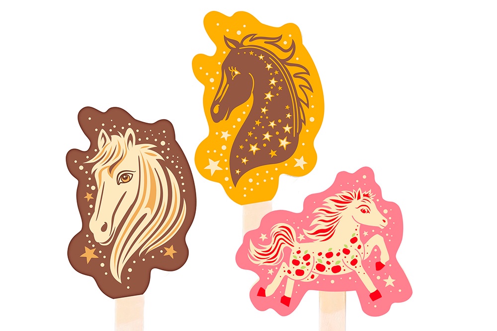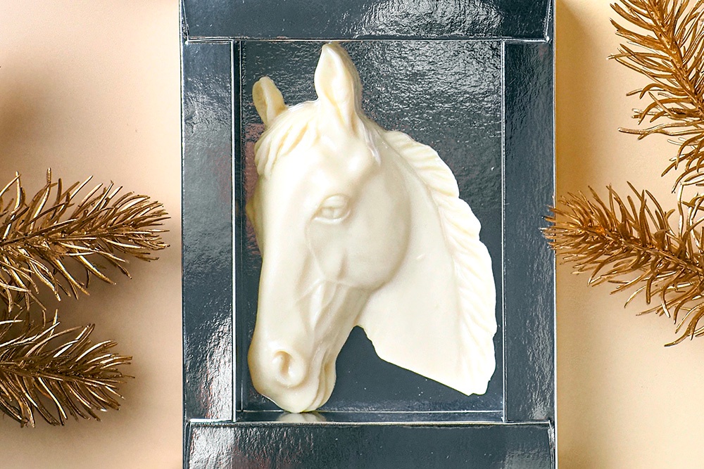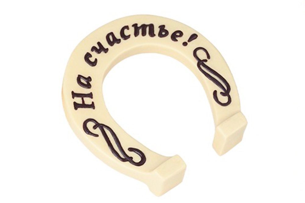 Здесь есть шоколадные открытки, барельефы лошадиных голов и даже съедобные настольные скульптуры из трех разных видов шоколада весом до трех килограммов! Не менее милыми, хоть и более скромными подарками, могут стать объемные подковы с надписью "На счастье", лошадки-игрушки и наборы конфет с поздравительными изображениями.