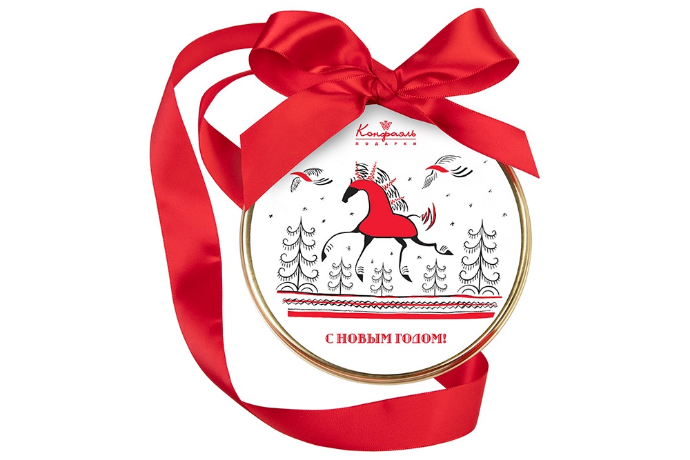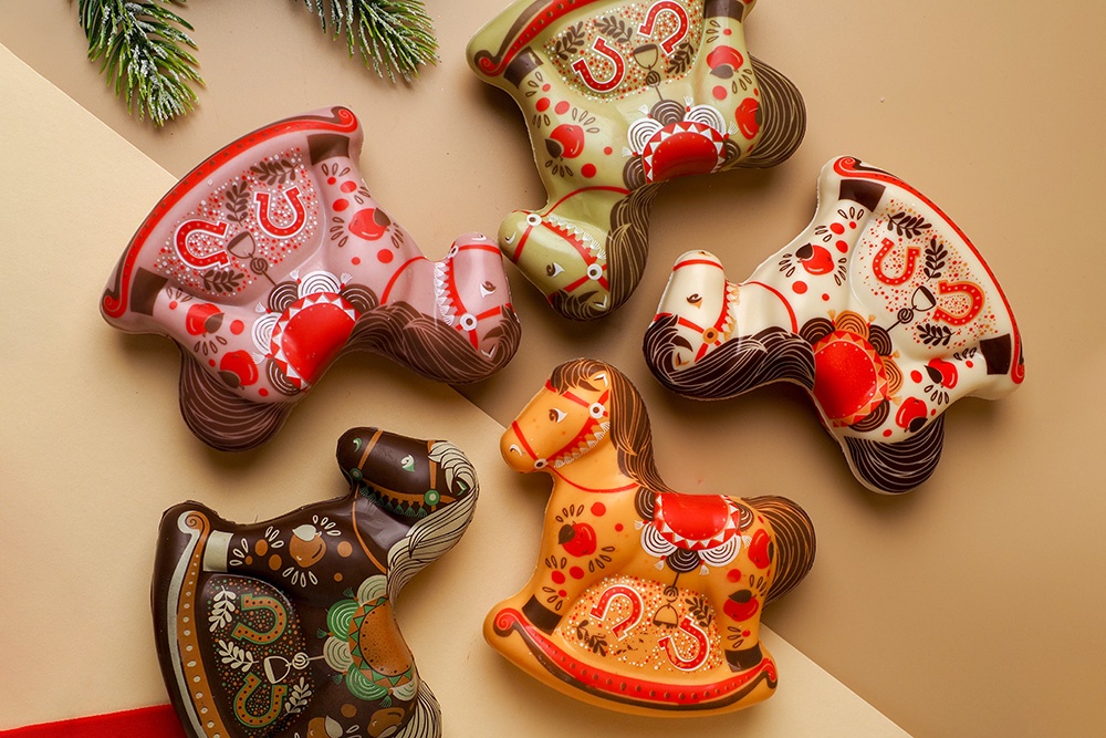 Отдельная линейка - милые лошадки-близнецы, отличающиеся только мастью: они выполнены из молочного, белого, клубничного, апельсинового и яблочного шоколада. Еще одно направление презентов к году Красной Огненной Лошади - стилизация мезенской росписи по дереву, популярной на Русском Севере. В этой линии не только упаковка, но и сладости оформлены в бело-красно-черной гамме.