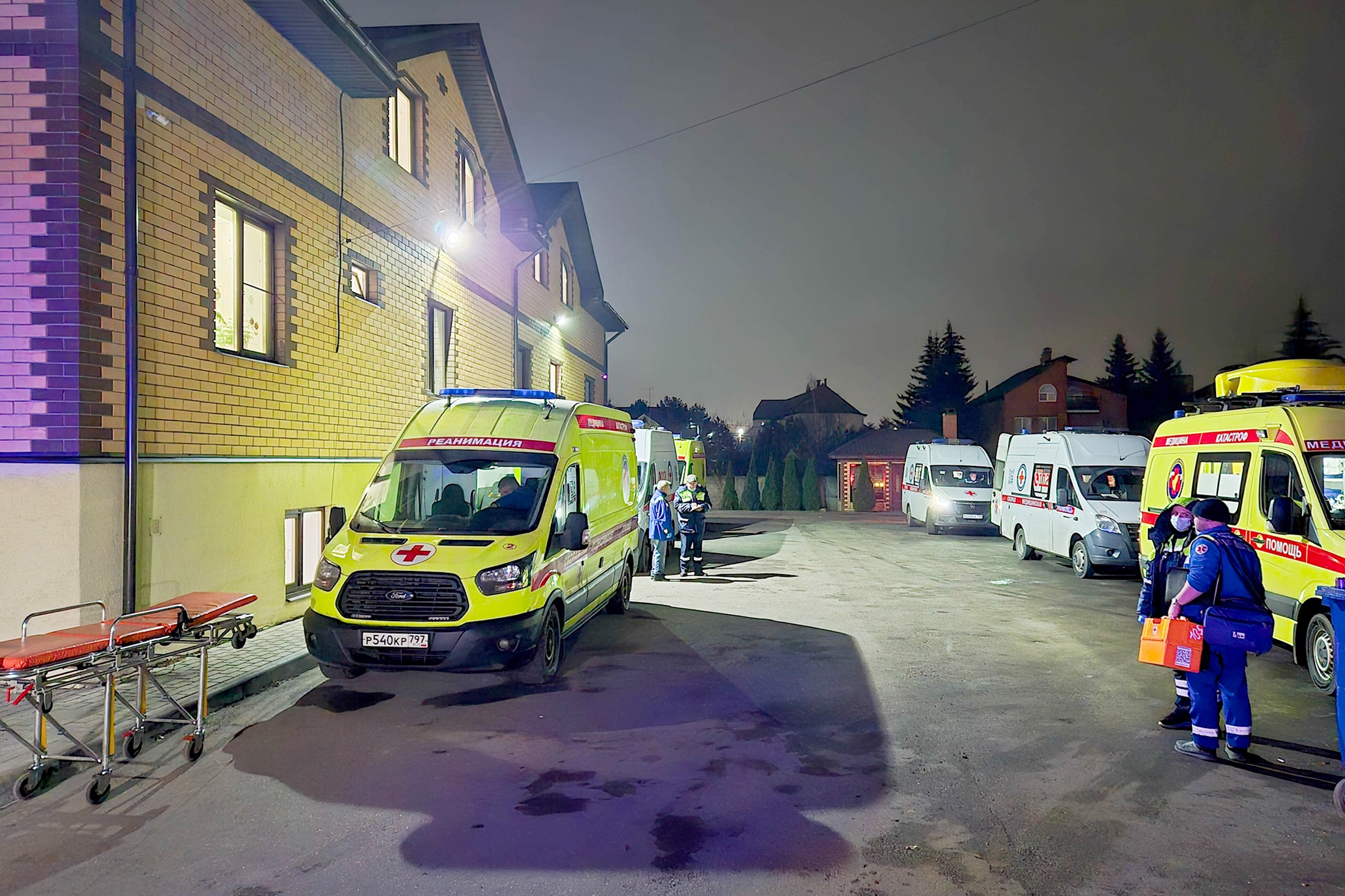 На фотографии видно строение, в котором находится социальное учреждение. Во дворе пансионата стоят три машины скорой помощи.