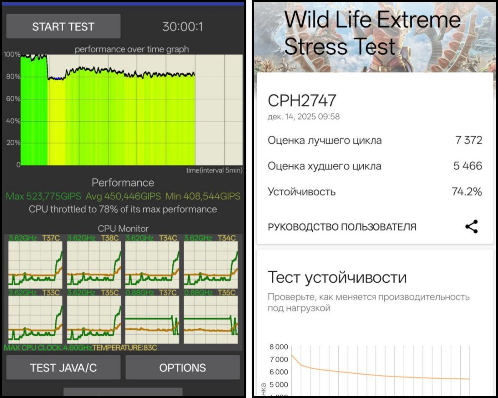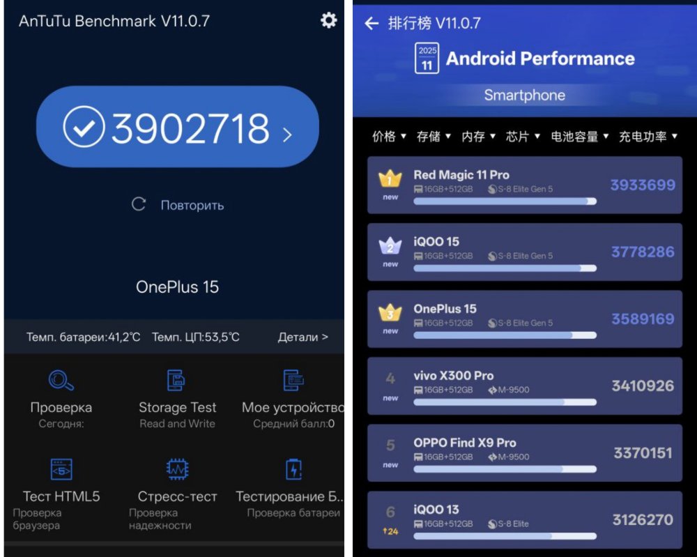 В синтетических тестах AnTuTu V11 OnePlus 15 достигает 3,9 млн баллов. Согласно сайту AnTuTu, это второй результат в мире после Red Magic 11 Pro. Но и это еще не все. В получасовом CPU Throttling Test производительность упала до 78%. Это очень хорошо, особенно с учетом сумасшедшей мощности Snapdragon 8 Elite Gen 5. 78% хватает на все "за глаза". Еще один тест - Wild Life Extreme Stress Test - показывает 74,2% устойчивости с оценкой худшего цикла 5466 баллов. Если перевести это на человеческий язык, то даже в самых хардкорных играх у вас не будет фризов и замираний даже на долю секунды, причем при максимально выставленной графике.