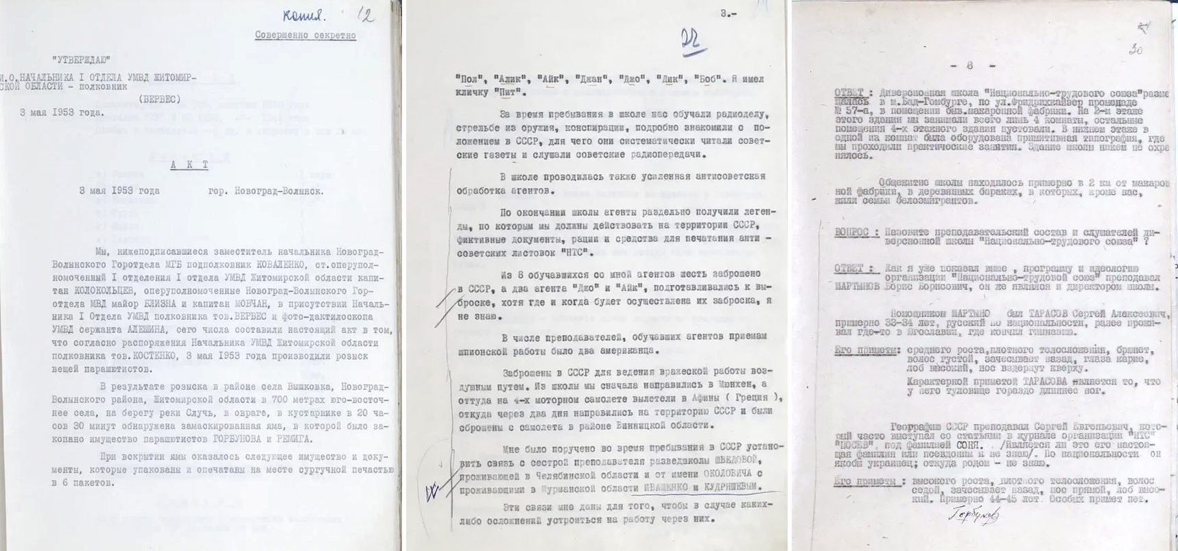 Чекисты установили, что Маков служил в составе зондеркоманды. Тогда 500 карателей из числа советских граждан были направлены в Крым. 28-летний на тот момент Сергей Горбунов, уроженец Сумской области Украины, как свидетельствуют архивные документы, до войны был посажен в тюрьму за воровство и грабеж. Затем немцами угнан в Германию, но был выпущен из лагеря и стал работать на нацистов. После войны остался в ФРГ, в 1951 году вступил в НТС. Гончаров прошел спецподготовку в упомянутой диверсионной школе, которой руководил белоэмигрант Борис Мартино, и через пару недель после ее окончания он и трое агентов были заброшены в СССР. У всех была надежная легенда-биография добропорядочных советских граждан, они были обучены тайнописи, передаче шифрованных сообщений по радиоканалам, правилам конспирации, ухода от слежки и прочим шпионским премудростям. Допросы показывают: инструкторы, в том числе из числа американцев, внушали им, что они должны всеми силами "бороться против режима большевиков". Ляхов на допросе заявил, что ему выдали "Браунинг" с 50 патронами, чтобы отстреливаться в случае преследования в СССР. "Говорите прямо: вам сказали расстреливать советских людей?", - спросил следователь госбезопасности. "Да!", - ответил Ляхов, которого, как и трех других диверсантов, снабдили ампулами с ядом.