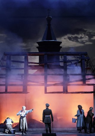 Премьера - грандиозную постановку Большим театром оперы Сергея Прокофьева "Семен Котко" как поучительной исторической притчи представили музыкальный руководитель Валерий Гергиев и режиссер-постановщик Сергей Новиков. Финальная фраза главного героя: "Пришел солдат с фронта - и пришел на фронт" - становится смысловым камертоном масштабного спектакля. В контексте года празднования 80-летия Великой Победы на редкость точной по смыслу и трогательной в эмоциональном плане, без всякого плакатного натиска, оказалась работа Красноярского театра. Речь - о мировой премьере оперы Александра Чайковского по прозе Виктора Астафьева в постановке Ирины Лычагиной "Любить на войне".