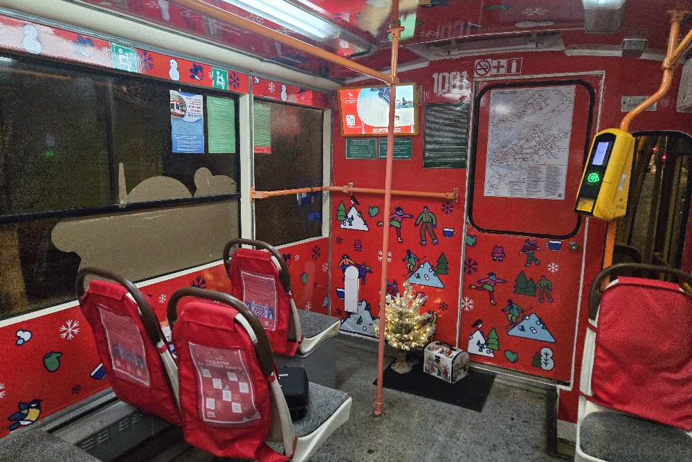 Кстати, снаружи новогодний трамвай (запускали его по распоряжению правительства области) оформили сдержанно - только огнями, ведь в светлое время суток он возит обычных пассажиров. А вот по вечерам - детские и семейные экскурсии. Чтобы попасть на них бесплатно, достаточно зарегистрироваться на официальном туристическом сайте "Зима в Самарской области: инструкция по применению". Зато внутри салона - раздолье Рождества: тематическая раскраска панелей, алые накидки на сиденья. Есть даже елочка, волшебные наушники для каждого пассажира и электронное табло, транслирующее видео, смикшированное из сказочных сюжетов и топовых видов города.