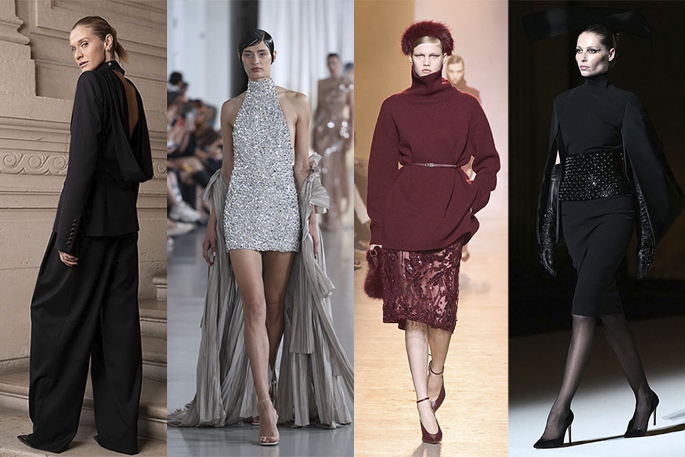 В тренде бархат, шелк, атлас для роскошного блеска и твид, вельвет, плотная шерсть для структурированных образов. Кружево и прозрачные вставки используются как деликатные акценты.