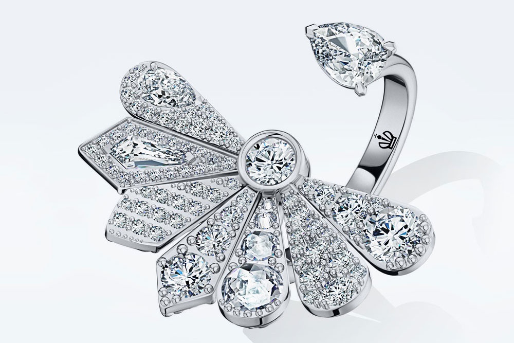 Новое кольцо из коллекции "Веера" украшено мотивом в виде давшего ей название дамского аксессуара с ассиметричными "лепестками". Дизайнерской стали крупные бриллианты старинной огранки "роза", редкой огранки "парус", а также классической круглой и грушевидной огранок. Поддерживает композицию бриллиантовое паве и солирующий крупный бриллиант грушевидной формы, закрепленный отдельно от веера.