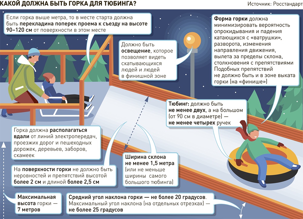 В ГОСТе, к примеру, приводятся параметры таких горок. Так, средний угол наклона горки не должен превышать 20 градусов, а максимальный (на каком-то отрезке) - 25 градусов. Максимальная высота горки - 7 метров. Если горка выше метра, то в месте старта должна быть перекладина поперек проема к съезду на высоте 90-120 см от поверхности в этом месте. Ширина склона должна быть не менее полутора метров (или не меньше ширины самого большого тюбинга). Наклон лестниц к месту старта должен быть не более 45 градусов, а каждые 2 метра нужно устраивать промежуточные площадки. На поверхности горки не должно быть неровностей и препятствий высотой более 2 см и длиной более 2,5 см.