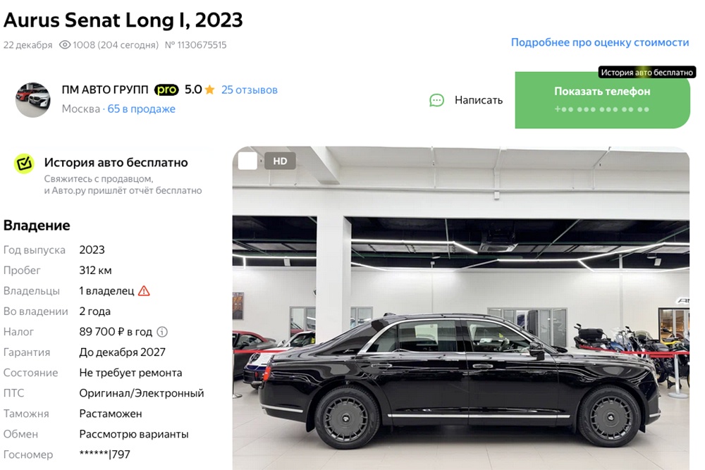 Таких всего пять: "Секретный" седан Aurus Senat Aurora выставили на продажу в РФ