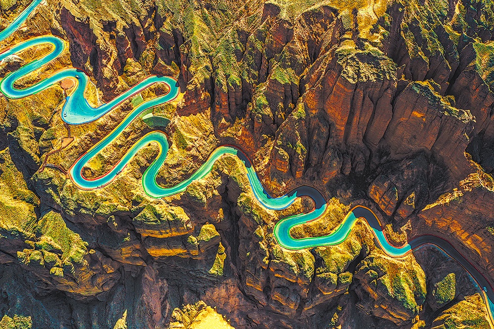 Вдалеке, среди гор багряного оттенка, заметна четкая граница, где осадки со дна реки смешиваются с почвой, принесенной с Цинхай-Тибетского нагорья. Изрезанные эрозией ущелья напоминают морщины, прочерченные на лике земли, - свидетельство неустанной работы природы на протяжении тысячелетий.