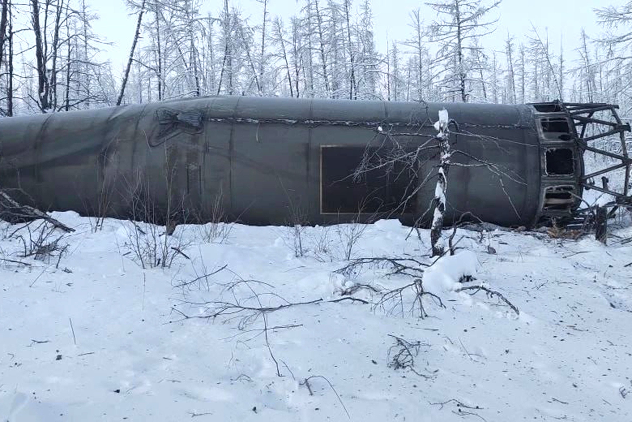 На снимках в заснеженном редколесье лежит огромный фрагмент ракеты — это топливный бак, причем целиком, рассказал старший группы спасателей Павел Алексеев.