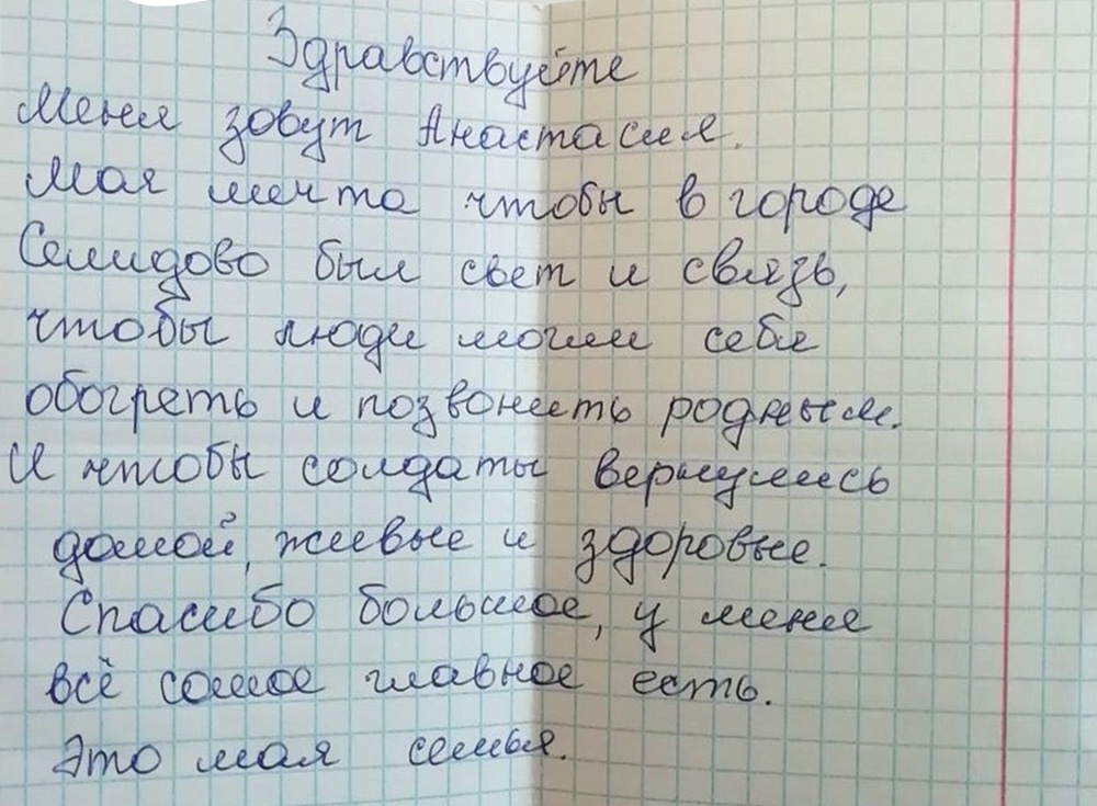 С особой теплотой передают военнослужащим письма от школьников. К написанию таких посланий ребята относятся очень ответственно, видно, что в каждую строчку вложена частичка их души. "Я знаю, дорогой солдат, что ты сейчас далеко от родного дома. Но, читая это письмо, ты вспомнишь о своих родителях и семье. Тебя очень ждут дома родные. Возвращайся скорее с Победой. С Новым годом!" - написала в "треугольнике" на фронт девятилетняя Маргарита Никанорова.