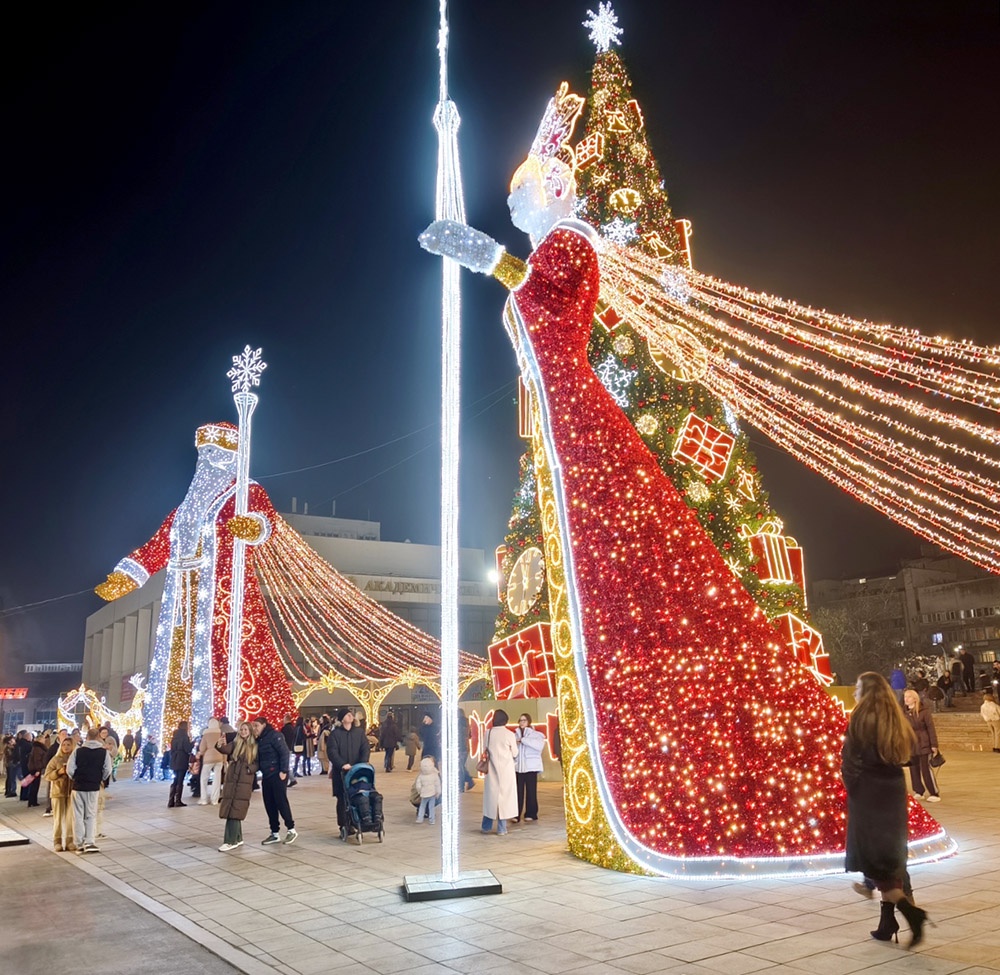 Порадовали в этом году дизайнерской елкой и жителей крымской столицы. 15-метровая лесная красавица словно шагнула на главную площадь Симферополя из сказки. Рядом с ней - 11-метровая фигура Деда Мороза и 10-метровая Снегурочка. Но дело не только в размерах, а в удачном творческом решении, которое уже оценили симферопольцы.