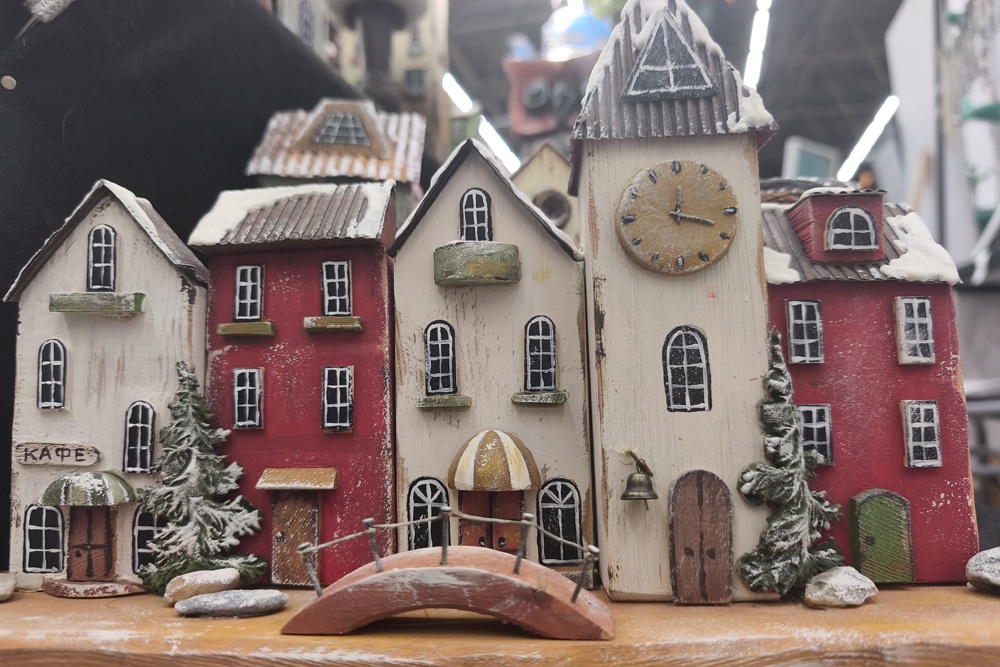 А Ольга Жукова из Екатеринбурга представляет на тюменских ярмарках тренд уральских мастеров - домики из бросового дерева. Мастер Ольга Коробкова специально не придает такому строению лоск, поэтому изделия выглядят так, будто в них кто-то живет: дверцы и окна открываются, колокольчики звенят, крылечки скрипят. Отдельные домишки покупатели берут как игрушки на елку (стоимость - 800 рублей), а композициями из нескольких соединенных зданий украшают подоконники, каминные полки, столы (цена такой "улицы" - до 5,5 тысячи рублей).