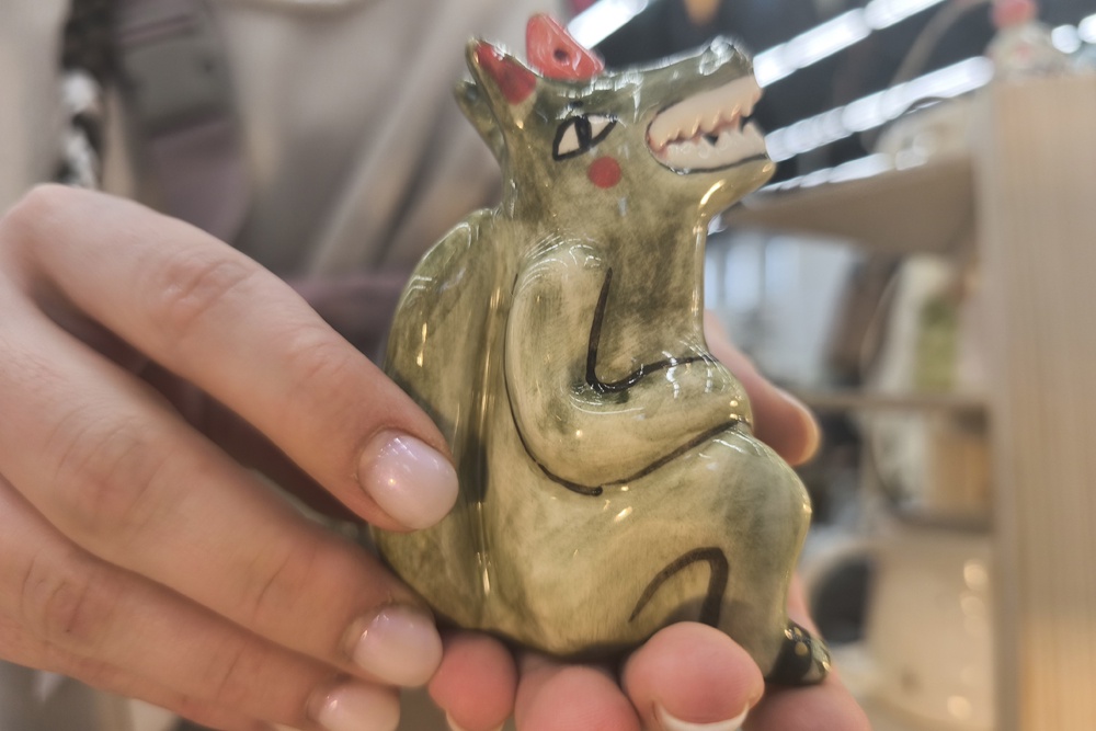 - Такие красавцы стоят по 3,5 тысячи рублей. Да, цена, возможно, кусается как волчок, но давайте вспомним все этапы работы: глину нужно добыть и подготовить, потом вылепить изделие, высушить и обжечь не на один раз, расписать, покрыть глазурью… Процесс трудоемкий и небыстрый. Мы лепим и крепим в пасти серого каждый зуб! Керамических коней отдаем на тысячу дешевле - их легче мастерить. Предложили покупателям глиняные пельмени и вареники - можно использовать как свистульку, а можно и как игрушку на елку - у самолепных есть ушко для ниточки. Хорошо раскупают керамические обвесы на сумки, которые тоже можно на елку повесить, - рассказывает София.
