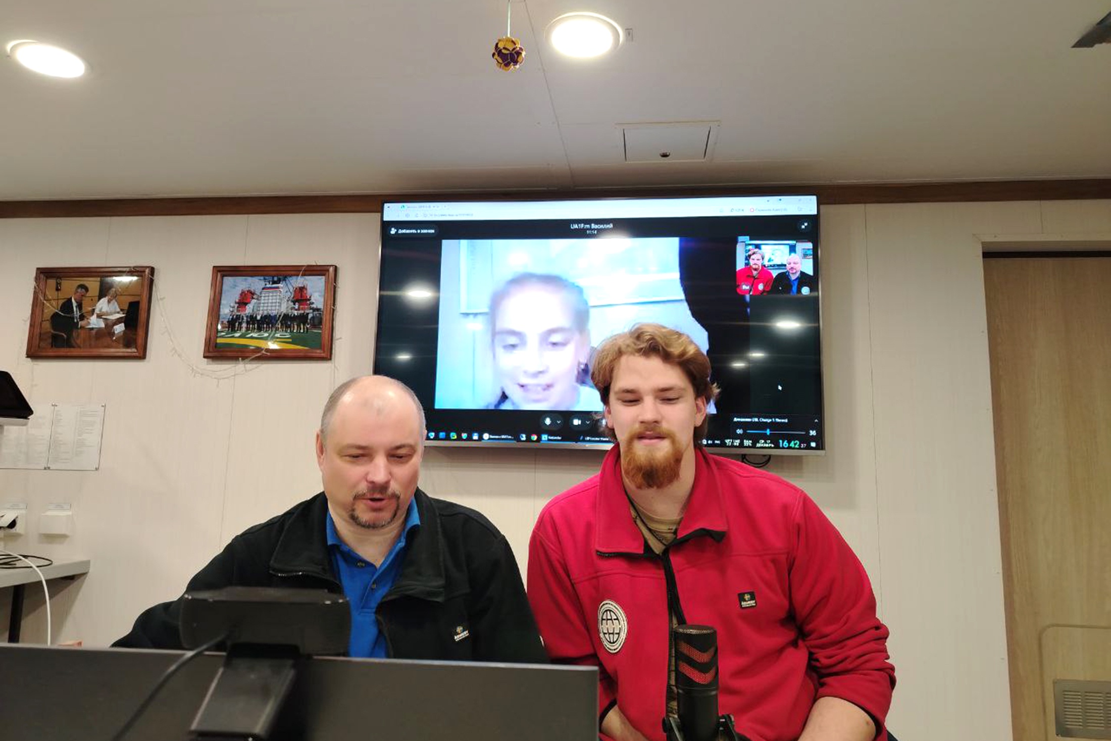 На первый вопрос от школьников должен был отвечать начальник станции "Северный полюс"-42 Александр Ипатов, начальник СП-42. Но не было: с утра должен был уйти в ледовый лагерь. У нас продолжаются подвижки льдины - и поэтому на ней почти круглосуточно кто-то что-то делает.