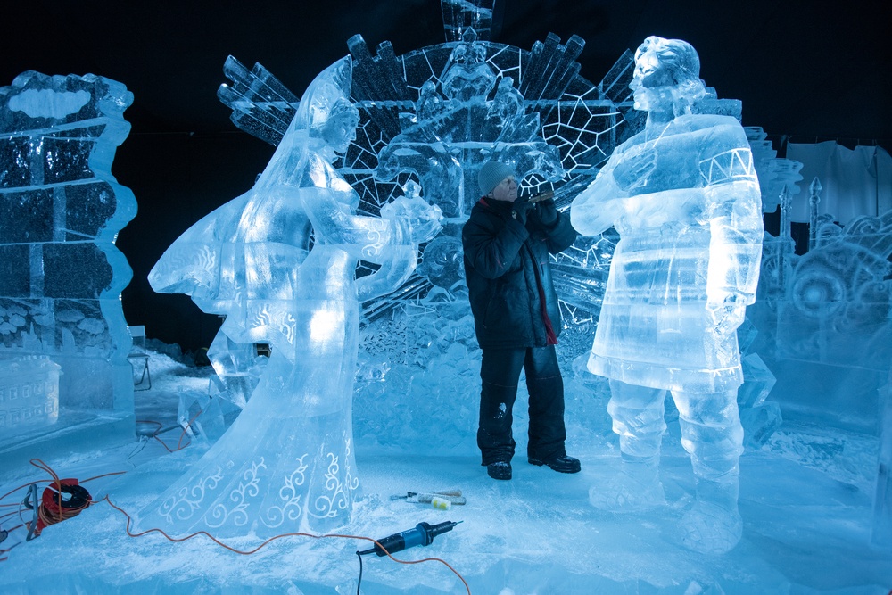 Известные челябинские скульпторы Анна Шарикова и Александр Подгорнов наводят красоту Хозяйке Медной горы, встречающей Данилу-мастера. "Мы живем на южном Урале, и сказы Бажова - наш бренд, - рассказывает Анна. - По льду у нас сезонная работа, а в течение всего года мы просто скульпторы: занимаемся малыми и монументальными формами, керамикой, деревом и так далее. Над "Каменным цветком" трудились две недели с перерывами на чаепития, чтобы согреться".