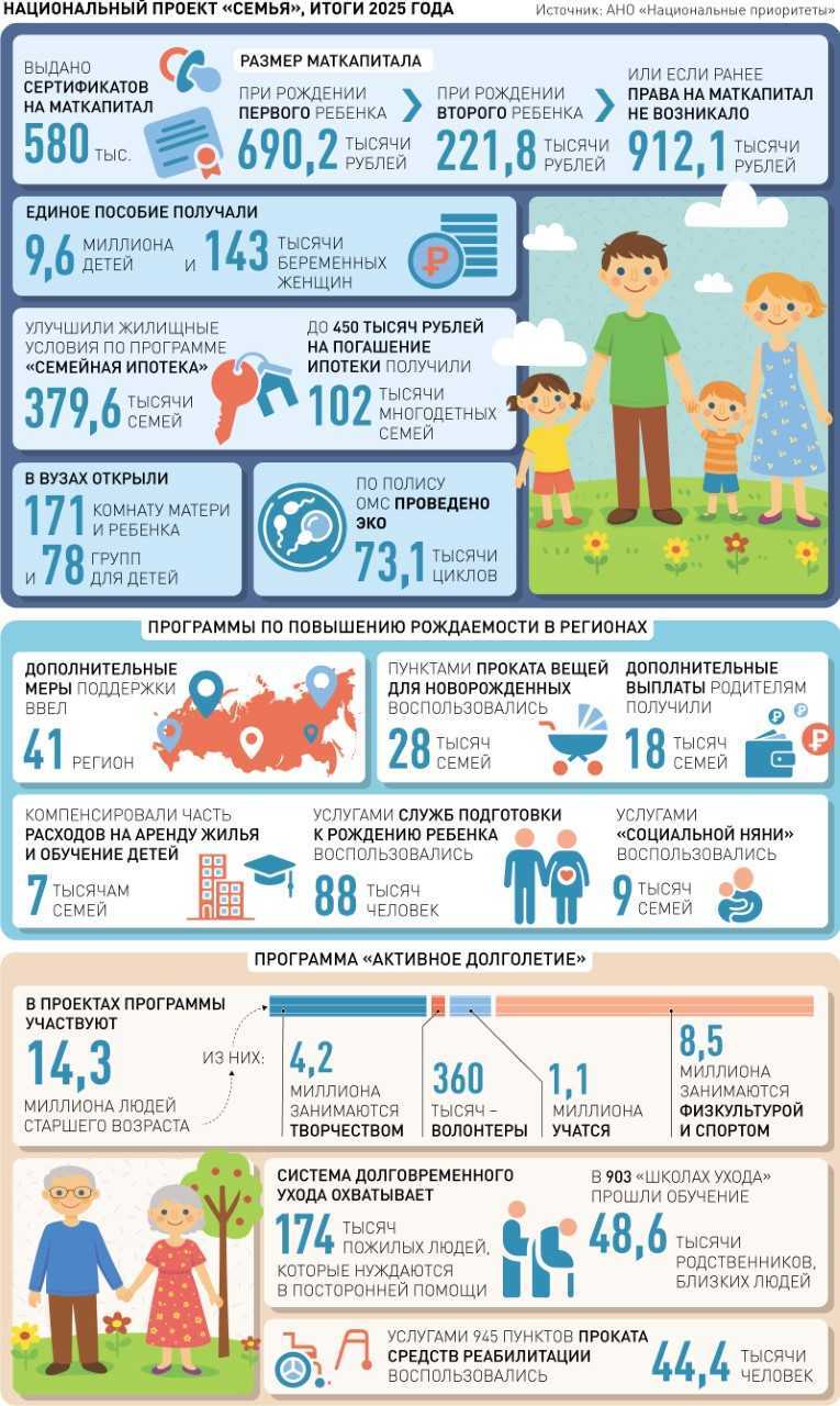 И это не все итоги первого года национального проекта "Семья", который стал расширенным продолжением нацпроекта "Демография". Он начал действовать с 2025 года и нацелен на то, чтобы в России стало больше семей с детьми, в том числе многодетных, а также на укрепление семейных ценностей. Для этого создают все условия.