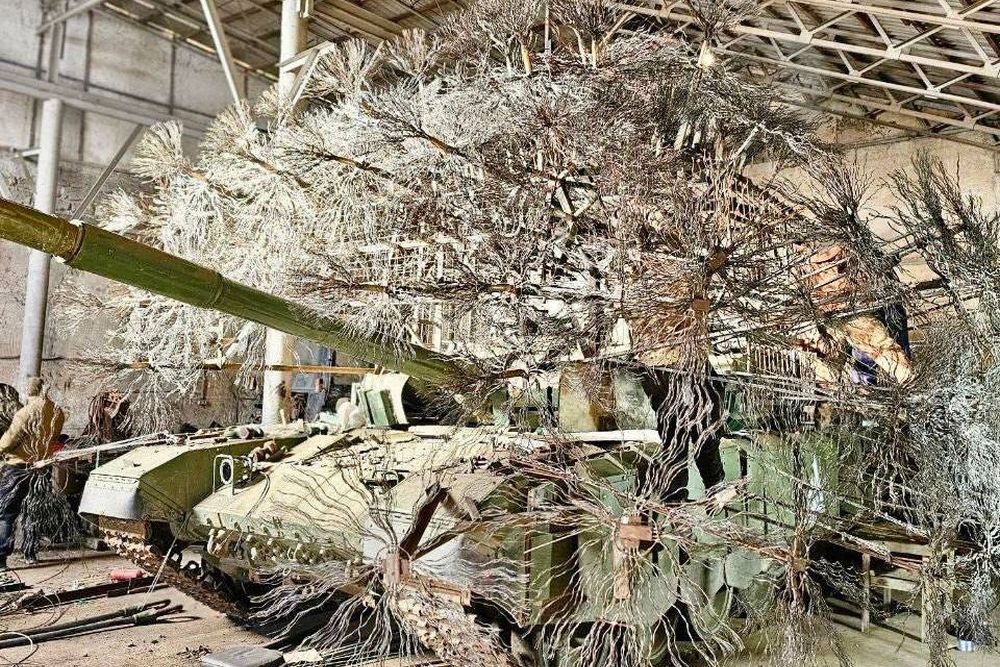 Полевые инженеры сделали из расплетенных тросов зонтики на длинных ножках, при помощи стальных стоек и растяжек вынесли их далеко за пределы габаритов машины. Получилась ажурная конструкция, не затрудняющая обзор и наведение пушки, но не подпускающая к танку FPV-дроны.