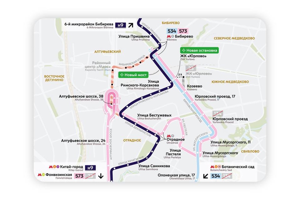 Электробусы н9 вместо части Алтуфьевского шоссе и Бибиревской улицы идут по улице Римского-Корсакова, Юрловскому проезду и новому мосту.