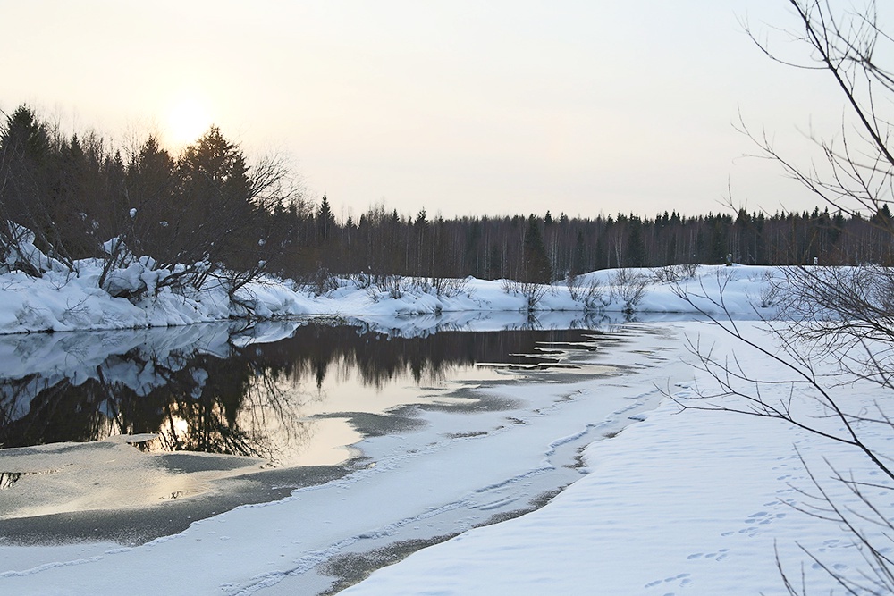 Но вот Вишера застыла. Застыла, да не вся. Строкой коротких и длинных тире тянутся письмена ледостава по речной телеграфной ленте. Кому и какие сигналы подает река? В такое время на этих про́духах, по-вишерски - та́ликах, можно нередко видеть выдр, а не только их следы. Осенью, богатой клестами, продухи часто навещают норки. Круговорот еды в природе.