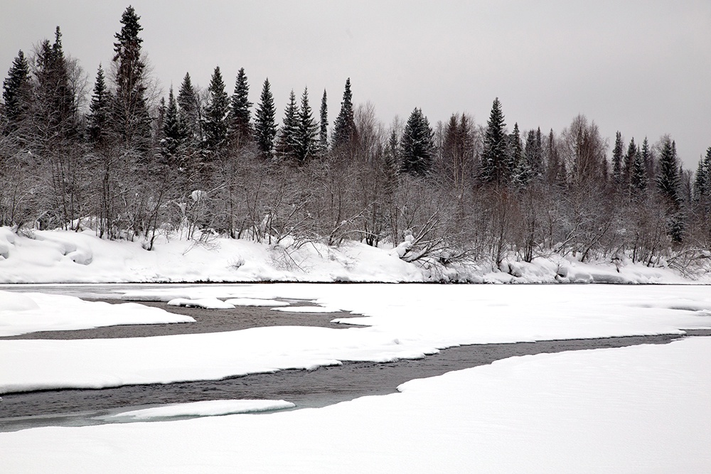 Так же и выше, и ниже по Вишере ледостав изощряется в вариациях, постепенно покрывая реку все разрастающимся и крепнущим льдом. Какая‑нибудь коряга, застрявшая осенью на неглубоком месте, образует ледяной островок, меняющий всю гидродинамику. Глядишь и диву даешься - полоса последней застывающей воды изогнулась луком на полреки…