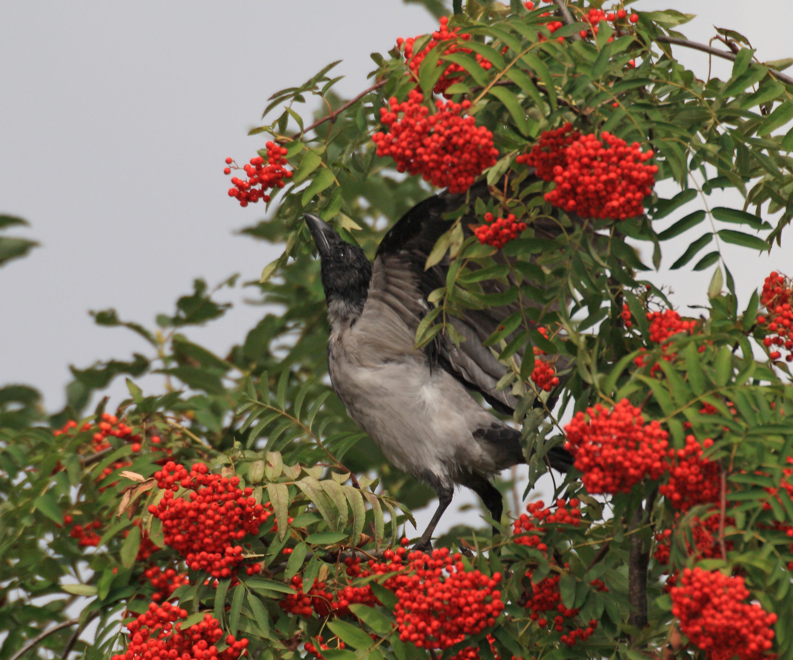 За общим столом не хватало только ворон - вероятно, у них был мясной день, и они промышляли по мусорным бакам. Как‑то в сентябре я сфотографировал ворону, с аппетитом поедающую рябину, ягоды которой еще не набрали морозную сахаристость.