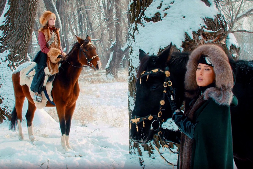 А теперь режиссер Байар Барадиев снял в заснеженных лесах и не менее выразительный и этнически-завораживающий клип. В нем Алсу и Адель уверенно держатся на лошадях, причем каждая - в своем фольклорном наряде. В кадре сменяются зимняя природа, леса, поляны, пасущиеся на воле табуны. А музыканты Ay Yola Ринат и Руслан снимались с народными инструментами в руках.