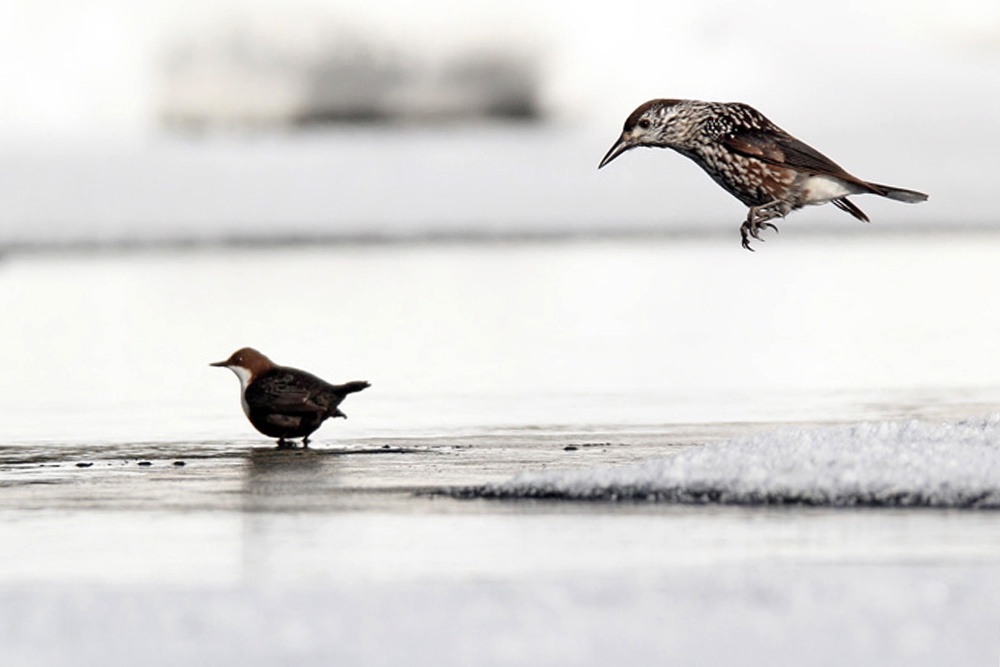 Одна фотография такая: оляпка забылась и хочет начистить физиономию кедровке, но в последний момент не решается и зависает над ней. Кедровка выглядит поразившейся: как, неужели эта мелочь хочет напасть?!