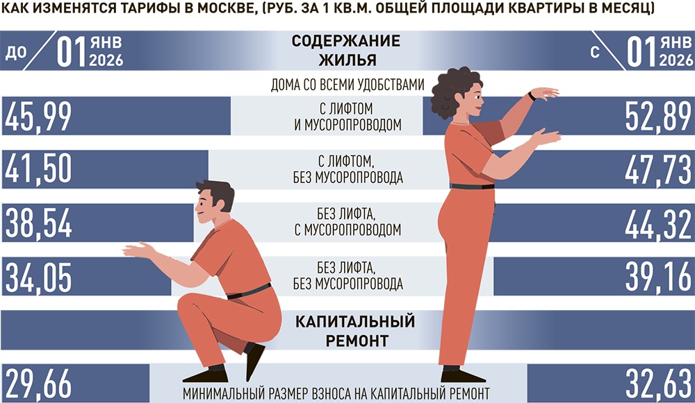 Для домов со всеми удобствами, с лифтом и мусоропроводом, которых в Москве большинство, до нового года действовал тариф 45,99 рубля с квадратного метра общей площади квартиры. С 1 января он вырос до 52,89 рубля - на 15 процентов. Значит, с 50-метровой двушки теперь будут брать на 345 рублей больше. Но если вы живете в пятиэтажке, то подорожание будет меньше - тариф поднялся с 34,05 до 39,16 рубля.