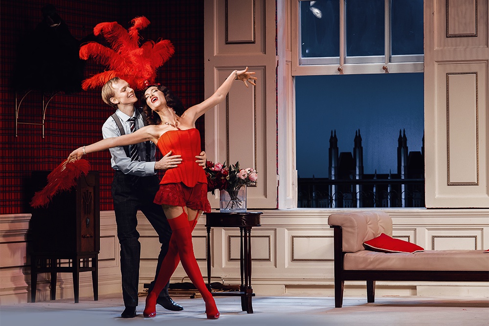 Но заметна и преемственность. На сцене все те же декорации: красная в серую клетку обивка стен, которой вторят юбка-килт управляющего отелем (Игорь Петров) и другие аксессуары. Правда, женские наряды стали более откровенными (сценография и костюмы Александра Боровского). А Сергей Угрюмов в первой версии играл официанта, во второй - секретаря Пигдена, а в третьей дослужился и до главной роли - помощника премьер-министра.