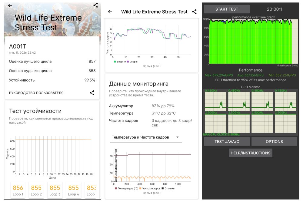 - В 3DMark Wild Life Extreme Stress Test температура во время теста поднялась на один градус, а "Устойчивость" составила 99% (это очень круто).
