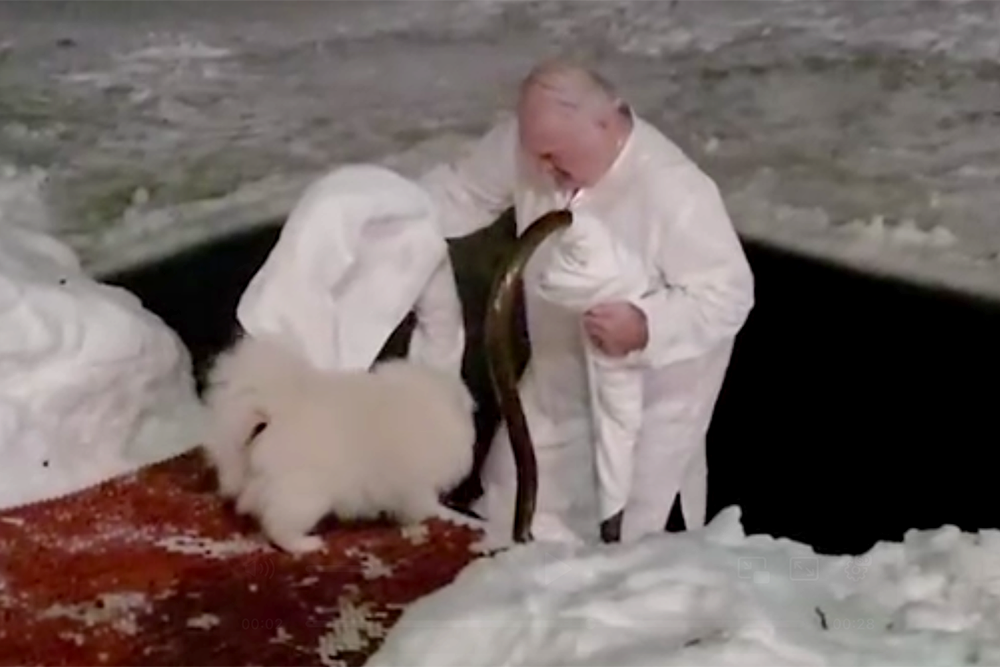 На видео Лукашенко в белой долгополой рубахе окунается в вырубленную во льду водоема купель. На "берегу" главу государства ожидал его питомец - шпиц Умка.