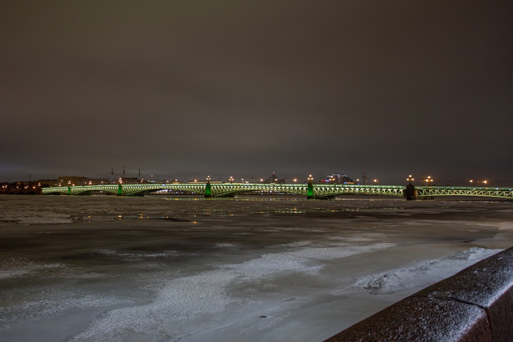 Традиционно сегодня вечером включат особенную подсветку Дворцового, Троицкого мостов и моста Бетанкура в цвета Ленинградской Победы. Эти три переправы подсветят зеленым и оливковым оттенками, символизирующими Победу и Жизнь, тем самым повторяя цвета колодки медали "За оборону Ленинграда" и ленты Ленинградской Победы.