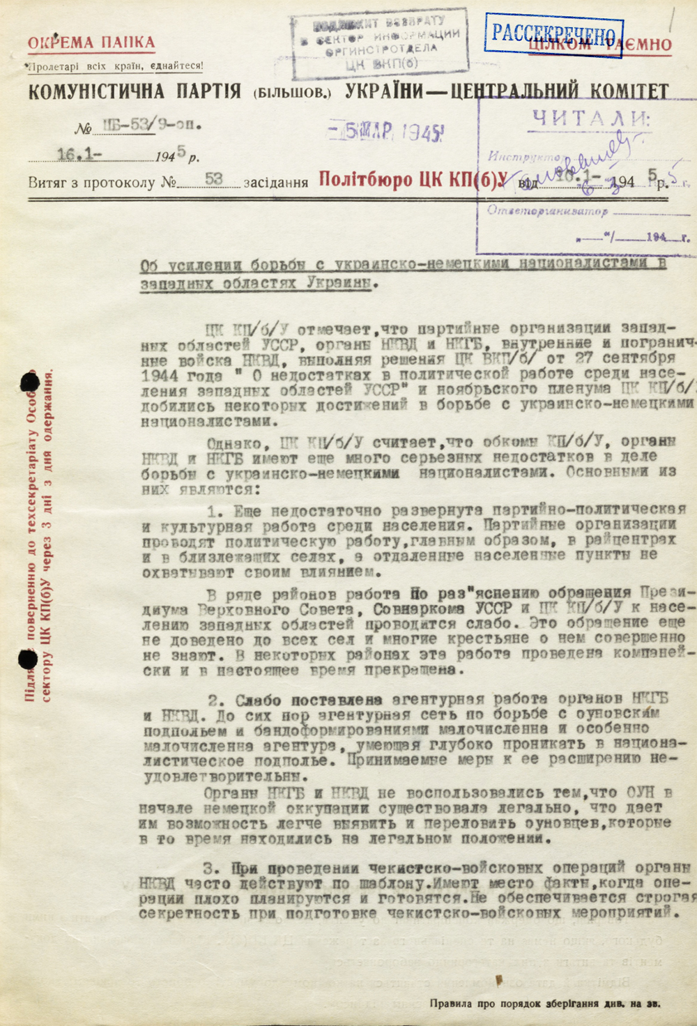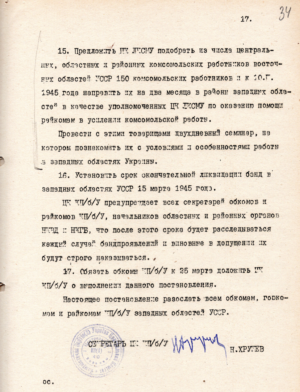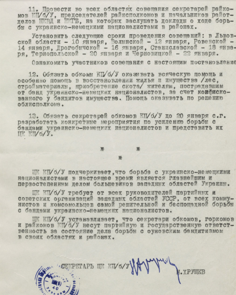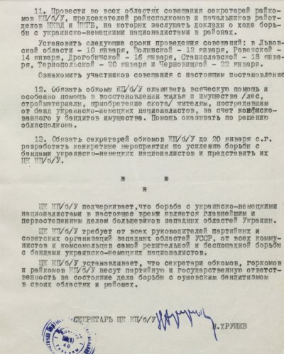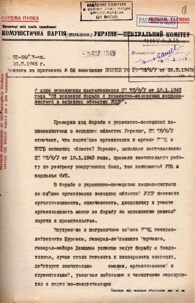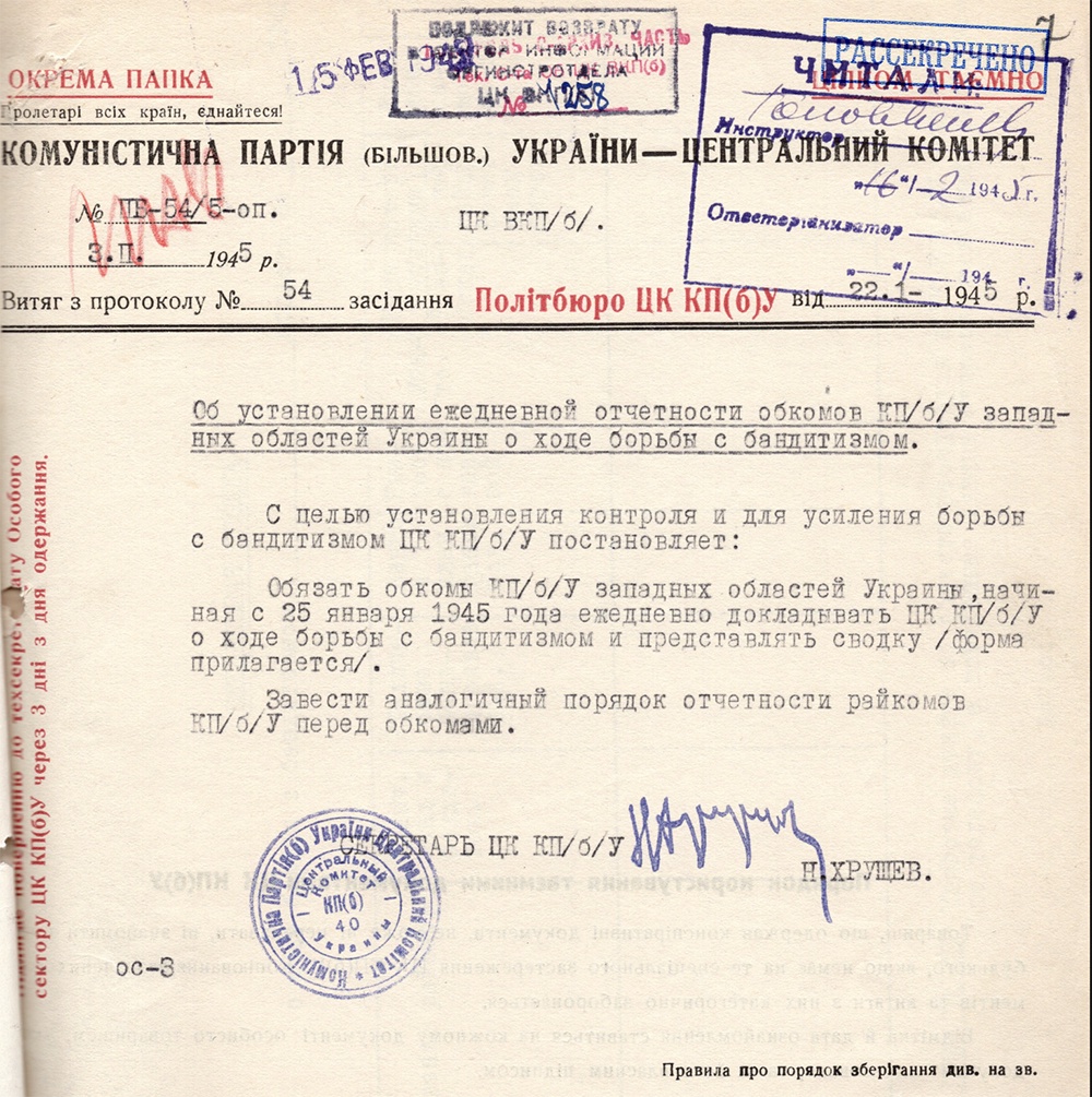 Еще до окончания войны, 10 января 1945 года ЦК Компартии большевиков Украины приняло постановление "Об усилении борьбы с украинско-немецкими националистами в западных областях УССР". В этот период власть довольно оптимистично думала, что эту проблему получится решить в короткие сроки. В нашем архиве хранятся два постановления начала 1945 года, подписанные Никитой Хрущевым, который в то время был первым секретарем Компартии Украины. В упомянутом январском говорится главным образом о вооруженном подавлении этого движения. А в февральском в актуальную повестку дня поставлены задачи "заняться налаживанием бытового обслуживания населения и восстановлением хозяйств в городах и районных центрах". Говорится там и о том, чтобы к 15 марта 1945 года разгромить оставшиеся банды украинских националистов.