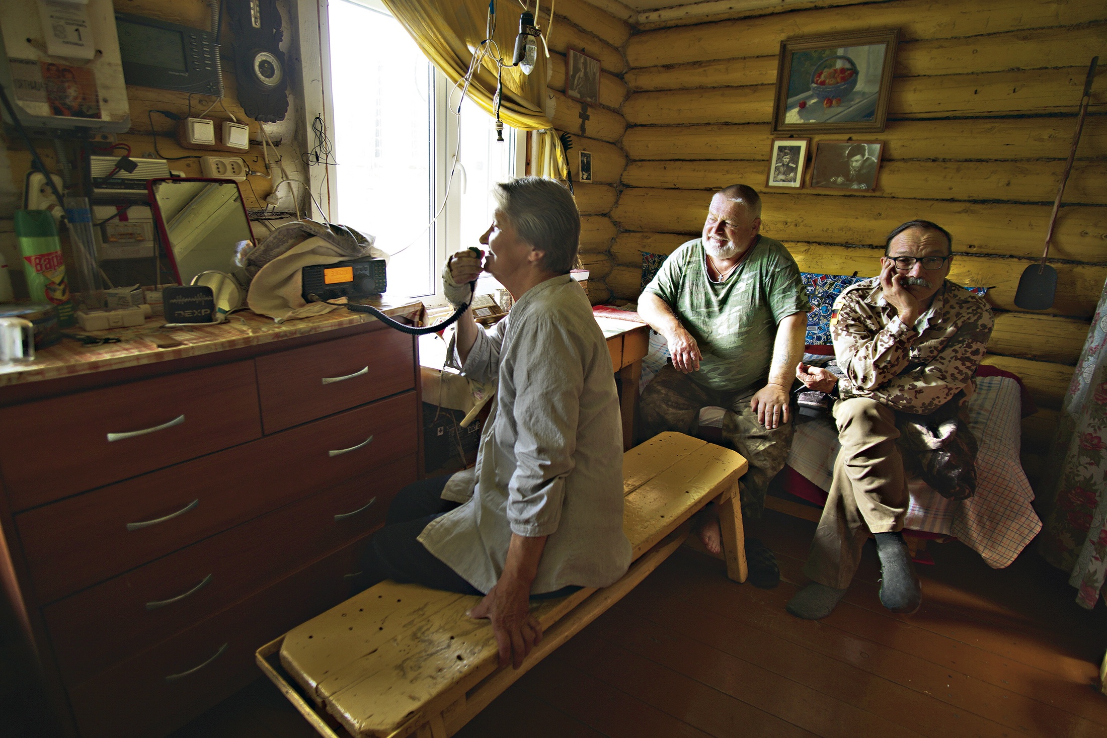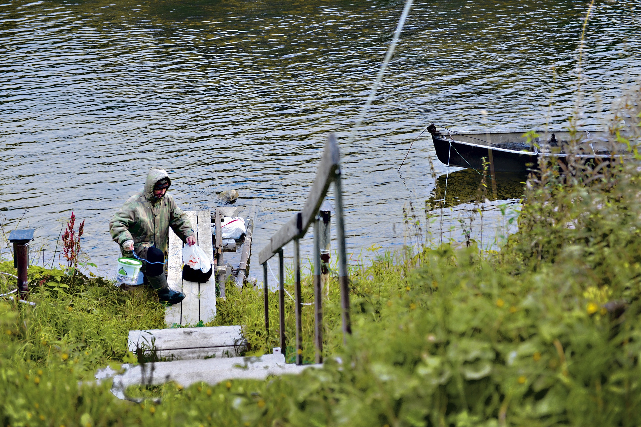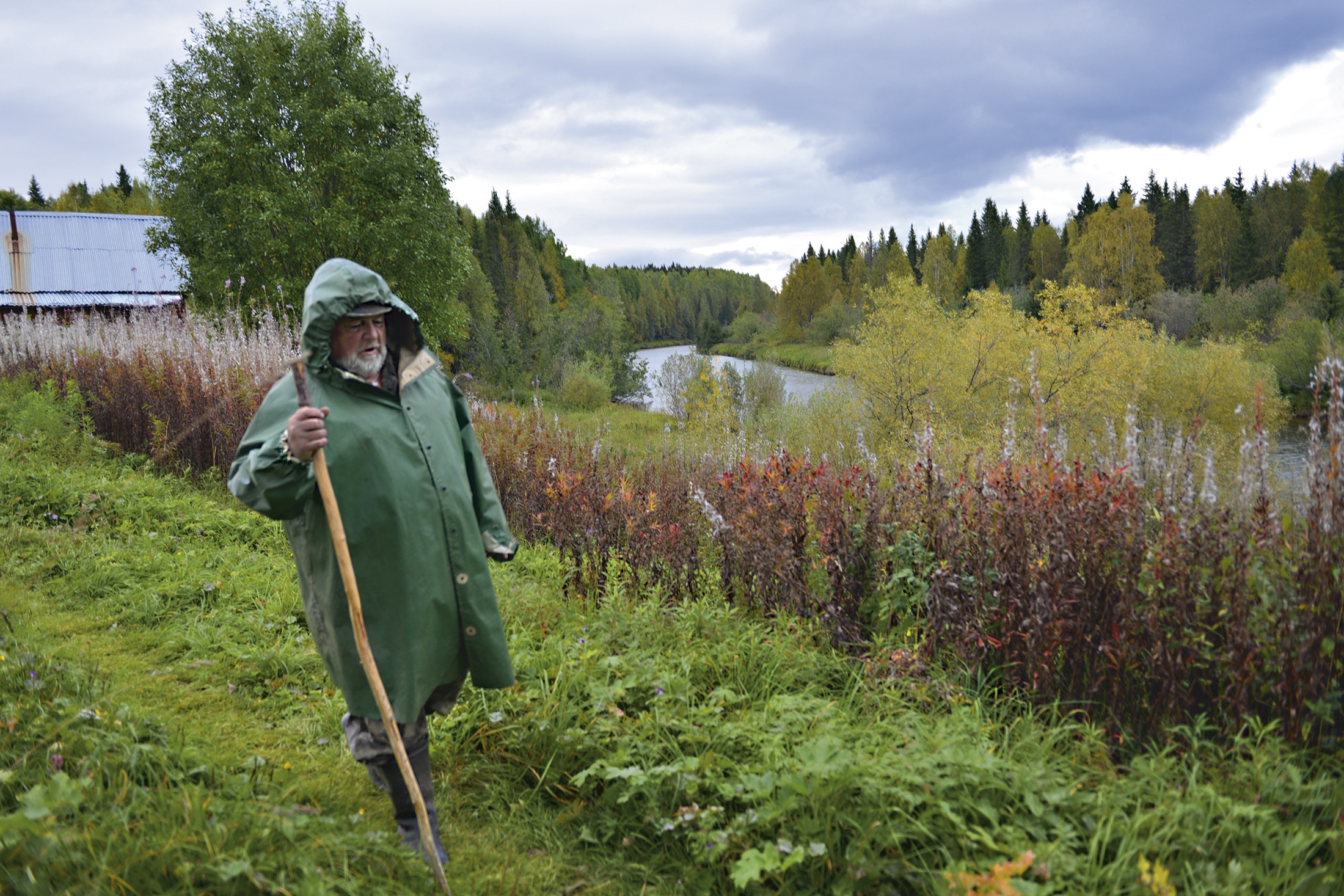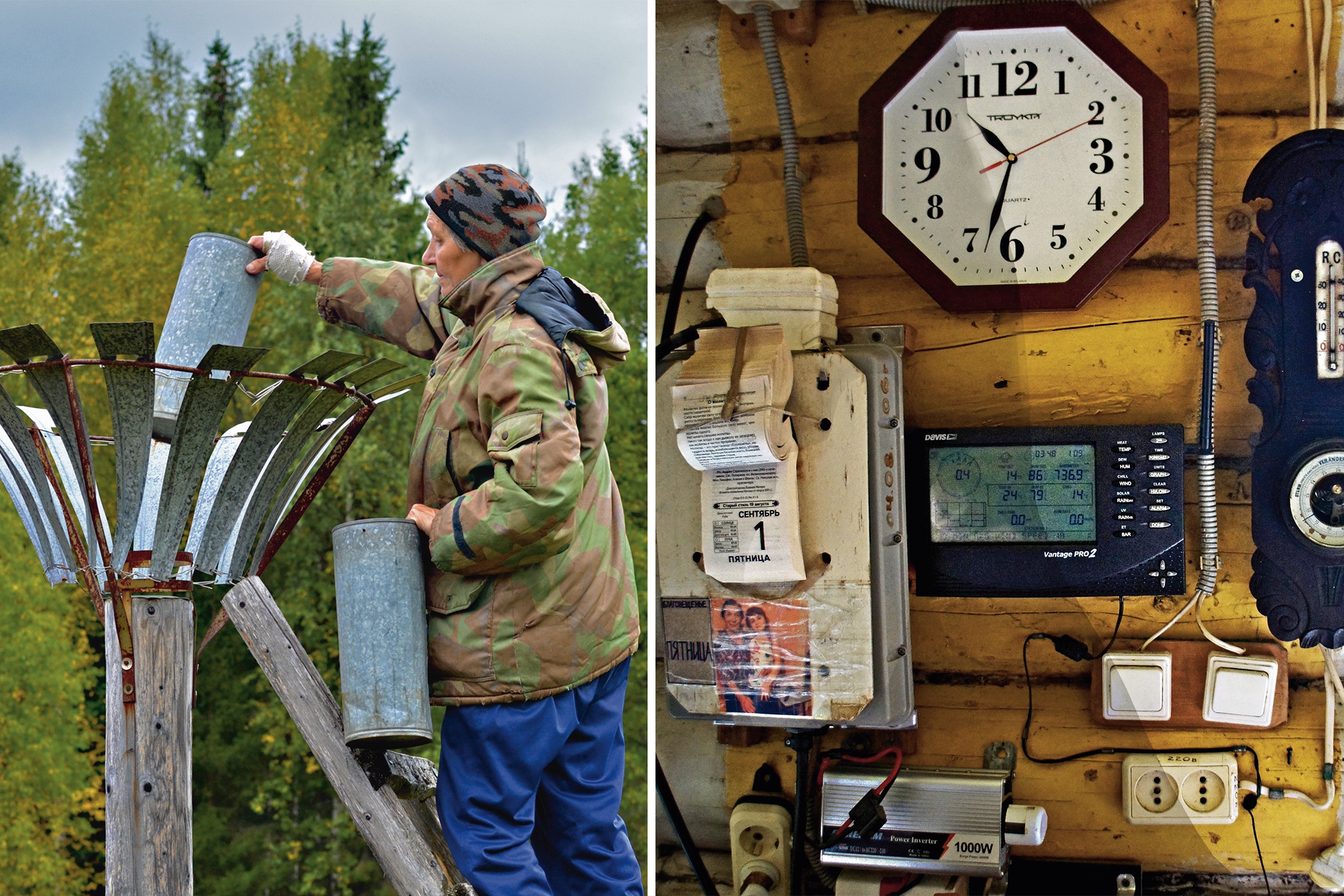Если встать спиной к реке, слева будет дворовое хозяйство Смирновых с котом Мавриком, который при любых съемках всегда оказывается в кадре. Справа - гостевые дома, которые редко пустуют. На крытой веранде избы "научников" мы увидели Василия Колбина, который настраивал подзорную трубу. А хозяин кордона взялся за ремонт бани. Поработает - отдохнет, поработает - отдохнет…