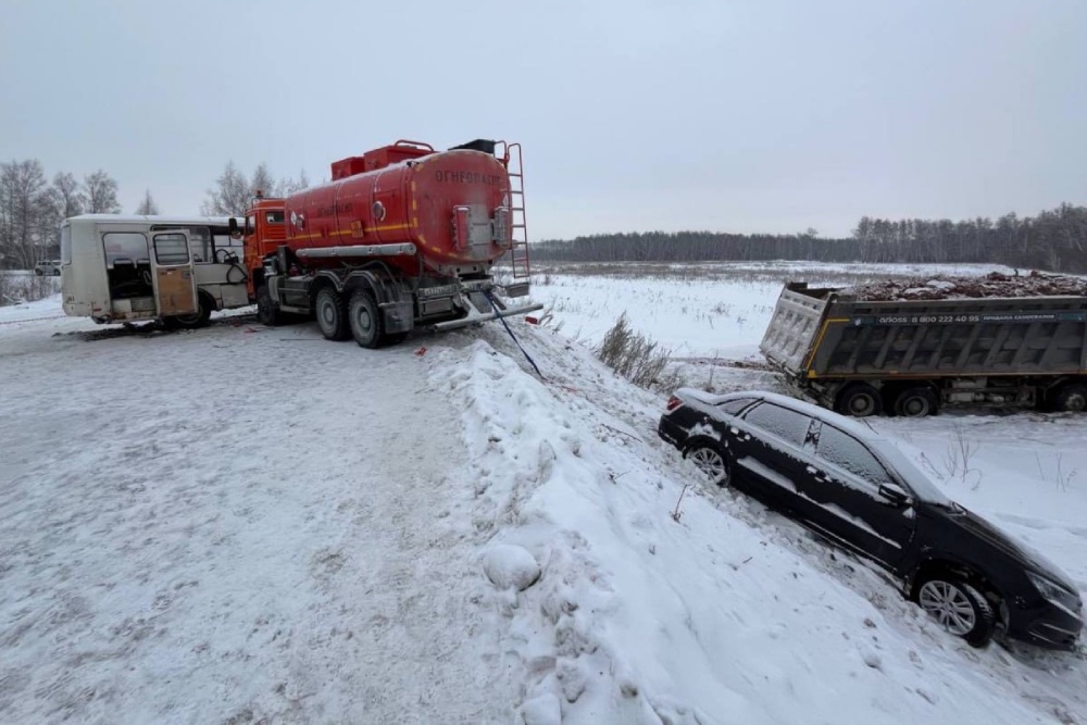 Судя по фото с места аварии, в кювет вылетели LADA и самосвал Howo. На проезжей части остались автобус и бензовоз.