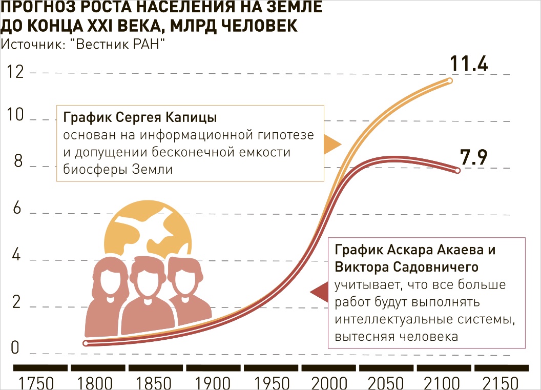Аскар Акаев: По оценке Сергея Петровича Капицы, численность землян к 2100 году выйдет на плато в 11,4 миллиарда человек. Наши расчеты с академиком Садовничим дали другие цифры: к середине века число землян не превысит 9 миллиардов человек, а к концу XXI века сократится до 7,9 миллиарда. В значительной степени это произойзет из-за проникновения различных интеллектуальных систем во все сферы жизни человека.