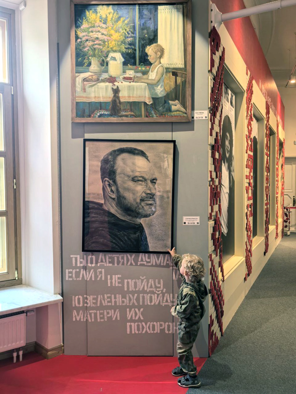 Сыновья грузят гуманитарку уже в рядах "Молодой гвардии". Дочки участвуют в патриотических мероприятиях. А самый маленький пока только в форме, как у папы, ходит на выставки и рассматривает портреты отца. Один из них сейчас выставлен в Музее современной истории в Москве (Выставка "Сестры". Тверская, 21). Его написал художник А. Новоселов.