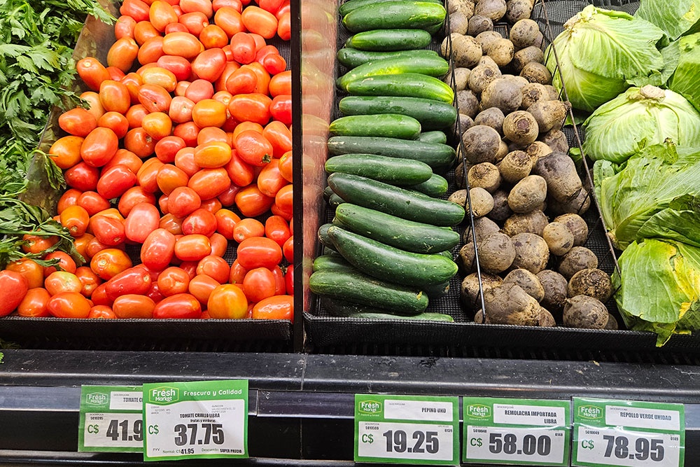 Первым делом мы пошли в овощной отдел, где я сразу увидел картошку - стоила она 39 кордоб за либру (одна никарагуанская кордоба равна примерно 2,18 рубля; один килограмм - это 2,17 либры), то есть килограмм картофеля стоит порядка 184 рублей. Морковь - 98 рублей за килограмм, лук - 156 рублей за килограмм, кочан капусты - 172 рубля, свекла - 210 рублей.