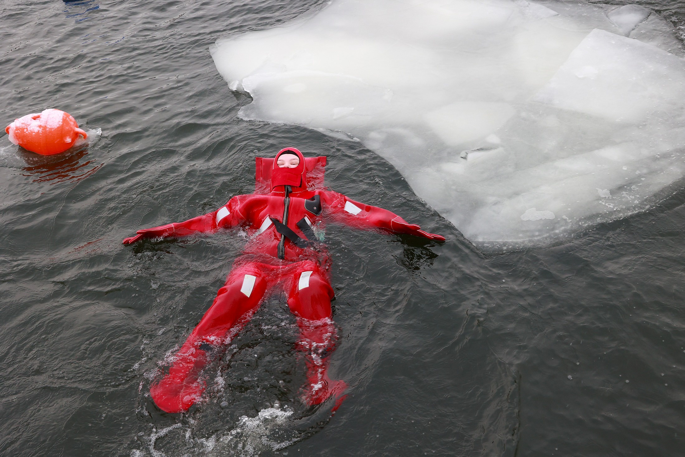 Этот аттракцион даже внешне сразу привлекает внимание. Так, в просторной проруби среди колотого льда плавают люди в специальном ярко-красном обмундировании, похожем отчасти на туловища креветок. Чаще эти люди спокойно плавают, раскинув руки и ноги. Ни спасать, ни вытаскивать их никто не торопится, напротив, изредка их подталкивают к центру полыньи курирующие заплыв спасатели.