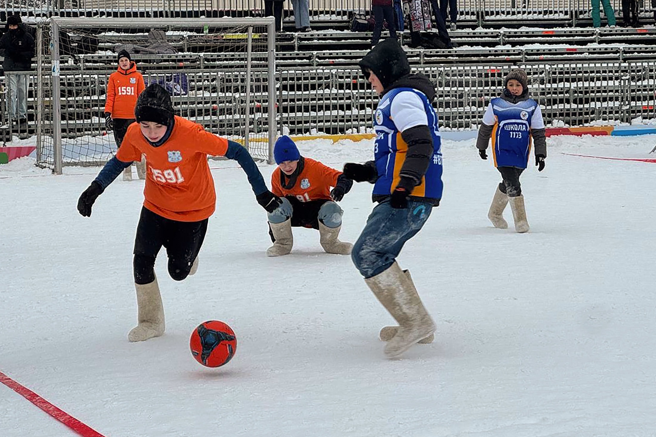 Его команда заняла второе место. Вова Лысеев из 9-го класса, член сборной, поделился: "В валенках было играть намного сложнее, я постоянно скользил и падал. Оцениваю свою игру на 6 из 10 - мог лучше, но иногда терял мяч".
